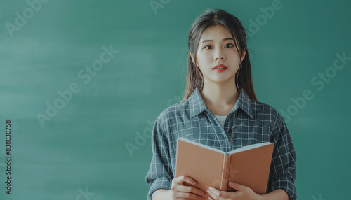 Confident Asian Teacher Standing in Front of the Chalk Board in Classroom