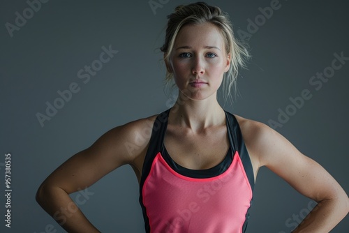 Confident athletic blond woman in studio portrait.