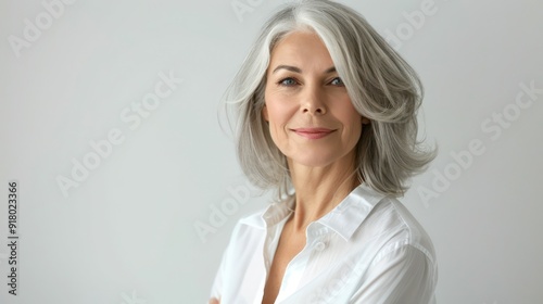 Confident beautiful mature business woman standing isolated on white background. Older senior businesswoman, 60s grey haired lady professional looking at camera, close up face headshot portrait.