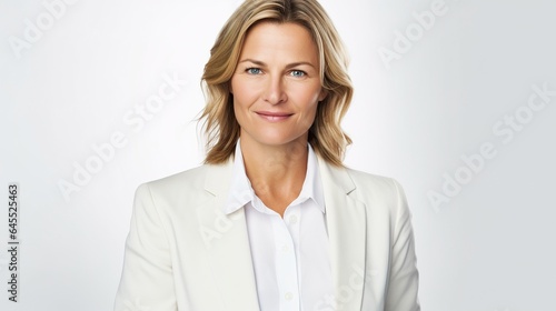 Confident blonde businesswoman standing in an office, wearing a professional suit, smiling with success and happiness, showcasing executive beauty and professionalism