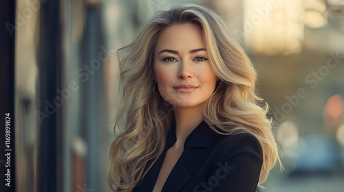 Confident blonde woman with long wavy hair, wearing a black blazer, smiles gently.