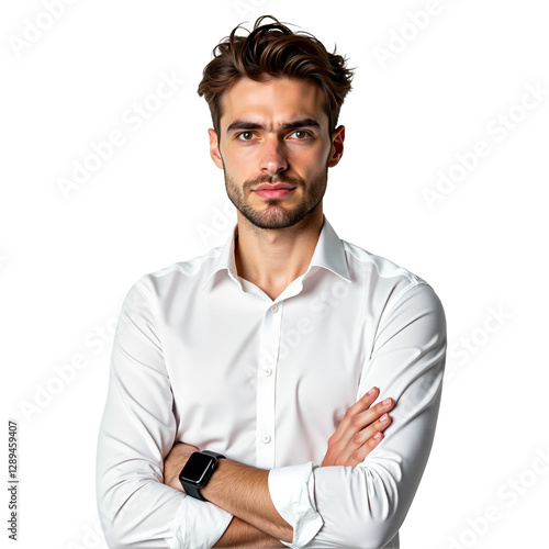 Confident businessman portrait, arms crossed, isolated on transparent background. Professional headshot for corporate website, profile, marketing, and business use.