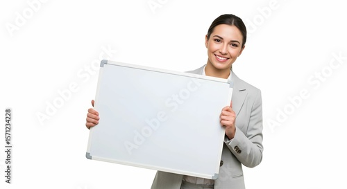 Confident Businesswoman Holds Blank Whiteboard, Ready to Present