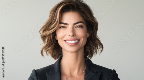 Confident Businesswoman in Blazer Smiling Brightly on Plain Gray Background, Captured with Professional Lighting Technique for Corporate Use