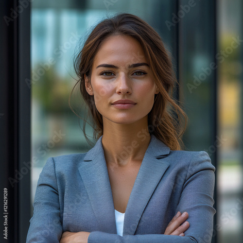 Confident Businesswoman in Gray Suit Standing Outdoors