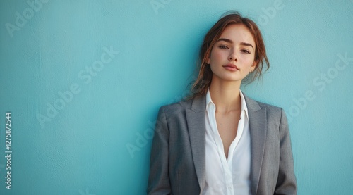 Confident businesswoman posing against blue wall portrait photo professional environment urban setting