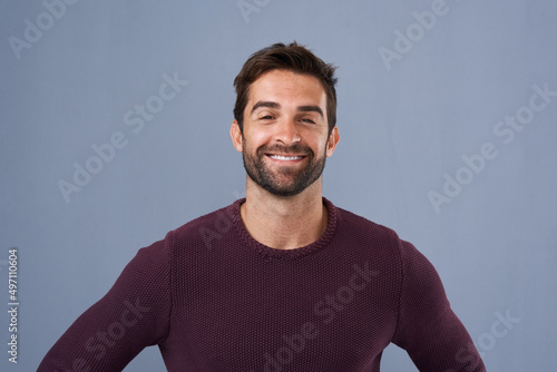 Confident by nature. Studio shot of a handsome and happy young man posing against a gray background.