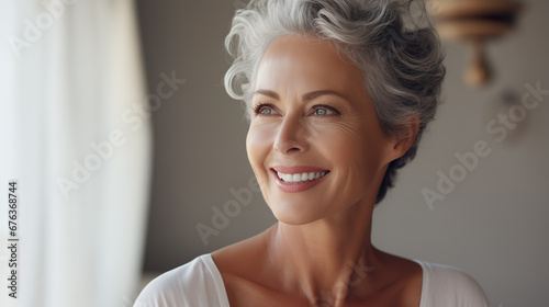 Confident elderly senior model with grey hair, smiling happy female lady in close-up portrait | Generative AI