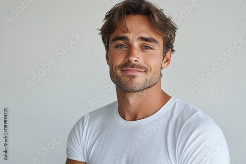 Confident happy middle aged man in white t-shirt smiling and looking at camera against clean white background