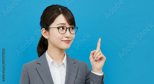 Confident Japanese Woman in Glasses with a Ponytail Gesturing a Creative Idea on Blue Background