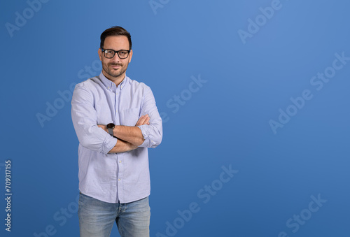 Confident male professional with arms crossed and eyeglasses looking at camera on blue background