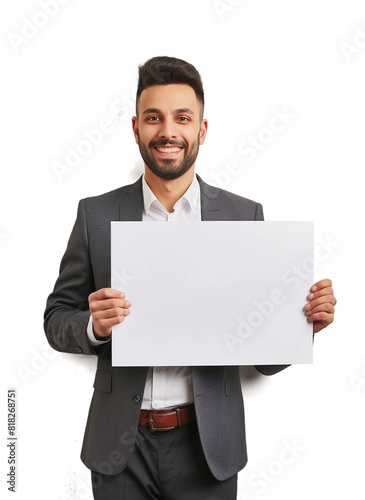 Confident man in suit holding a whiteboard isolated on a transparent background