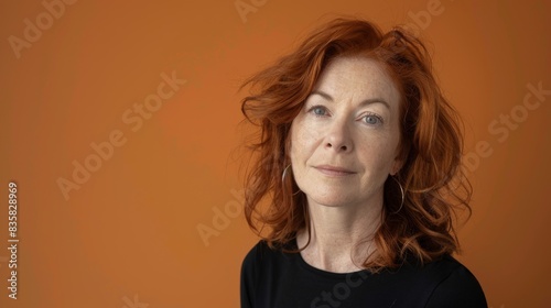 Confident mature woman with red hair, studio portrait on colorful background. Vibrant portrait of a redhead woman, celebrating aging beauty.