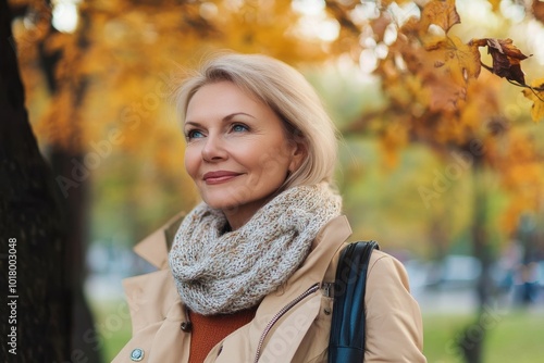 Confident Mature Woman with Silver Hair Smiling Warmly in a Autumn Park