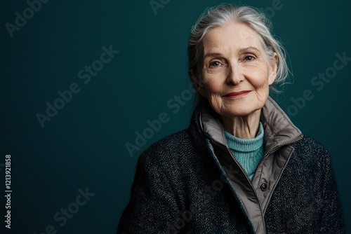 Confident old woman in a smart jacket, isolated on dark teal background.