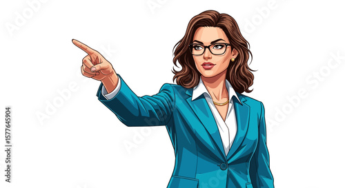 Confident Professional Woman Pointing Direction in Business Attire with Focused Expression and Clear Vision