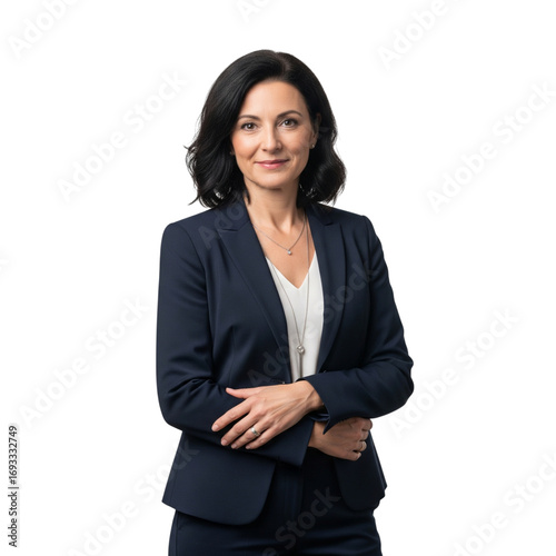 Confident professional woman with dark hair and a smart navy suit smiles warmly, arms crossed, radiating competence and approachability for modern business and corporate needs.