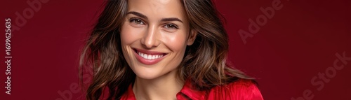Confident smile from red blouse woman concept. A smiling woman in a red shirt against a vibrant background.