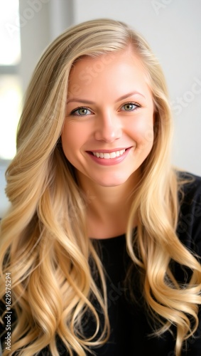 Confident smiling businesswoman with blonde hair radiating positivity in a professional setting