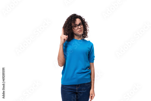 confident successful young caucasian woman with curls dressed in a blue t-shirt