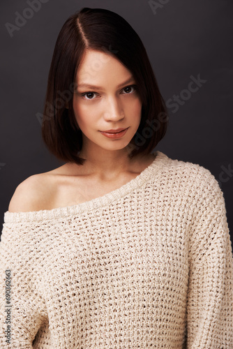 Confident, sweater and portrait of woman on dark background for fashion, winter style and trendy clothes. Natural beauty, shoulder and face of person with jersey for cozy, comfort and warm in studio