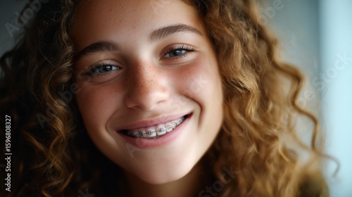 Confident teenage girl with curly brown hair, green eyes, freckled face, beaming while displaying dental braces, expressing youthful joy and self assurance