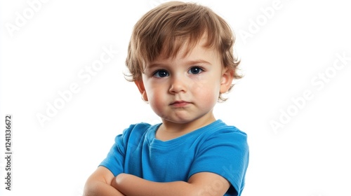 confident toddler boy with curly hair in bright blue shirt posing with crossed arms on bright white background showcasing innocence and determination