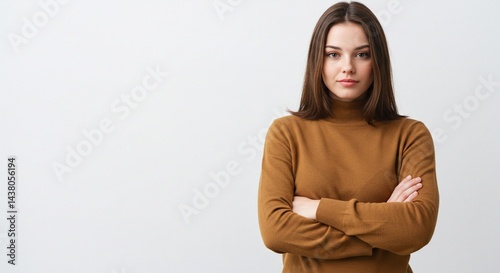 Confident woman in a brown turtleneck sweater with arms crossed in front of a white background looks confidently at the camera.