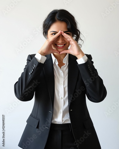 Confident Woman in Business Suit Smiling and Gesturing with Hands