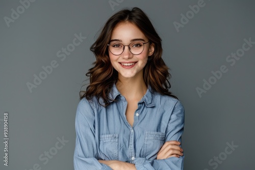 Confident woman in glasses posing with folded arms.