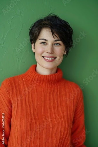 Confident Woman in Orange Sweater Against Bold Green Background for Modern Portrait Design