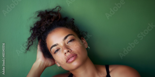 Confident woman portrait on green background, a natural portrait of a woman expressing confident