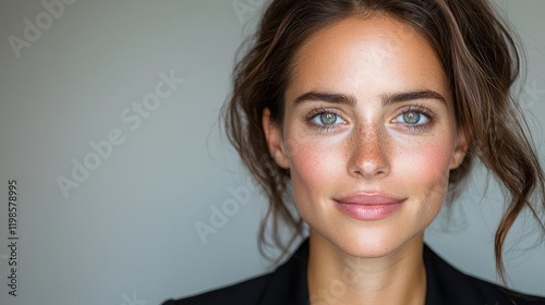 Confident woman portrait, studio shot, neutral background, beauty & skincare