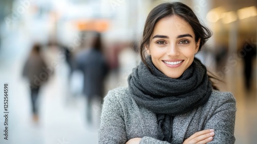 Confident Woman Smiling in a Scarf Against a Blurred Urban Background with Soft Lighting