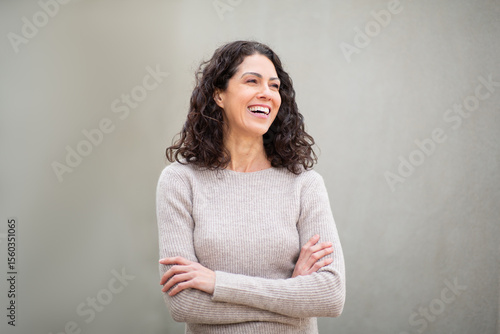 Confident woman standing with arms crossed, smiling and laughing while looking to the side