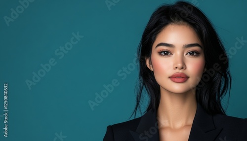 Confident woman teal background portrait, studio shot, beauty, cosmetics, advertising