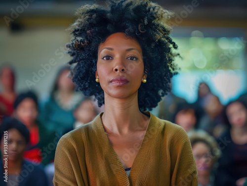 Confident woman with curly hair standing amidst a blurred crowd, capturing focus and presence in a professional setting.