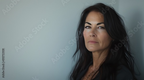 Confident Woman with Intense Gaze, Portrait on Neutral Background, Simple Elegance. Contemporary Photographic Style. AI