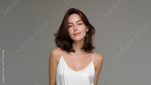 Confident woman with natural makeup and short brown hair wearing white silk camisole, posing in studio with neutral background, representing elegance, beauty, and minimal fashion