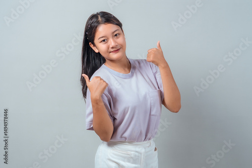 Confident young Asian woman in casual outfit smiling and showing two thumbs up gesture, standing against plain background. Positive and happy expression.