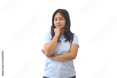 Confident Young Asian Woman Posing with Thoughtful Expression on White Background