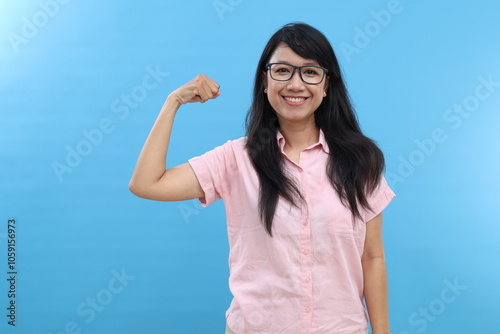 Confident young Asian woman raises hand up and shows demonstrates strength looks like strong powerful bodybuilder. isolated over blue background