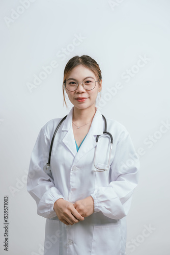 Confident young female doctor wearing a white coat and stethoscope smiles warmly with arms folded, portraying professionalism, compassion, and dedication in a modern healthcare setting.