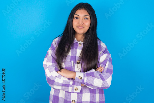 Confident young latin woman wearing plaid shirt over blue background with arms crossed looking to the camera