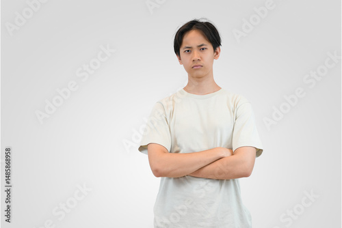 confident young man standing with crossed arms on isolated background