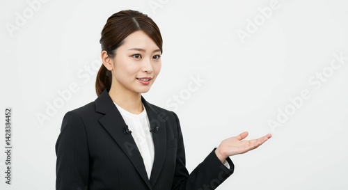 Confident young professional gesturing presentation with clean aesthetic background
