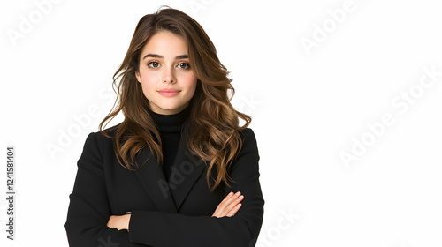 Confident young woman, arms crossed, studio portrait, white background, professional headshot