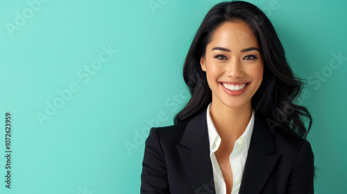 Confident young woman in a sleek suit, radiating happiness and success in her professional portrait.