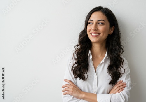 Confident young woman in a white shirt with crossed arms looking to the side and smiling against a white background