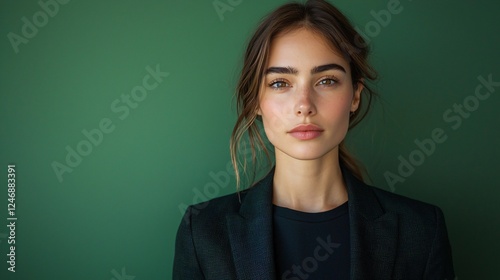 Confident Young Woman in Black Outfit Posing Against Solid Green Background